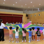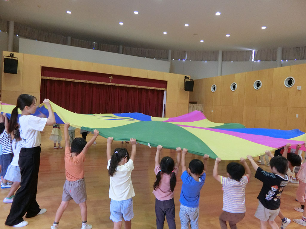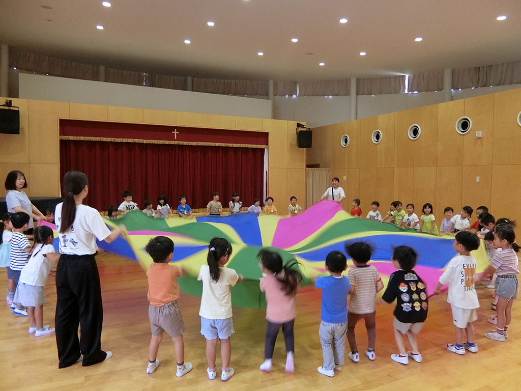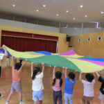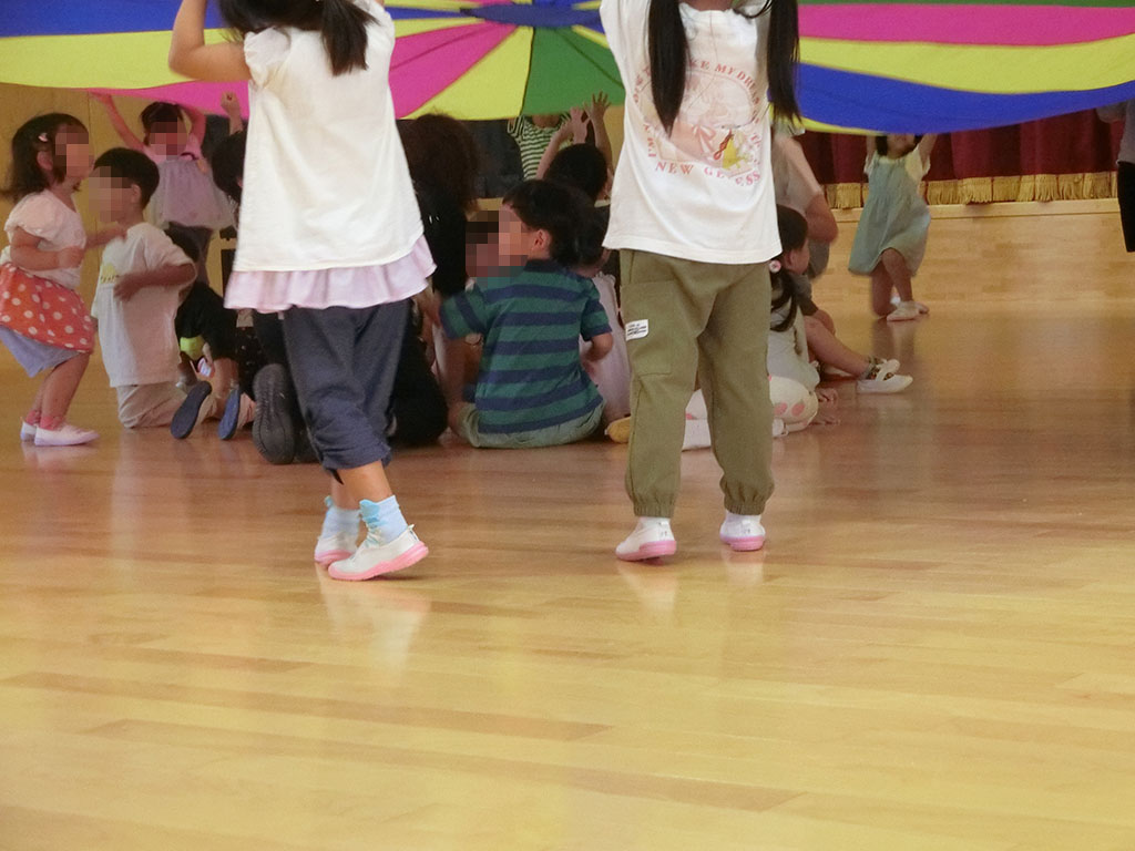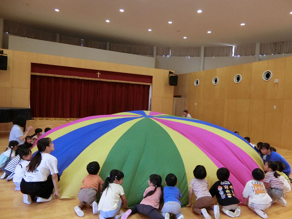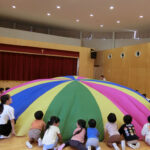 お知らせ 園だより 2025.10.15 運動会後は・・・ 運動会は雲ひとつない晴天の中、 それぞれ力を発揮して行うことができました♪ 年中が楽しんでいるのかな?と思ったら・・・ バルーンの中に年少クラスが座っています! 一緒に『山』を作ります♪ 引っ張って~ 上げる~ 「できた!!」 年中の子どもたちはとっても得意そうに教えてくれています。 (持ち方や座り方の指導まで! 担任としては、そこまではいいかなと思っていたようですが) 年中の自信に満ちた顔と、年少の嬉しそうな顔がいっぱいで 「これこそ、運動会後の楽しみだよね~」と嬉しくなりました!